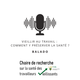 La Chaire de recherche UQTR (jr) sur la santé des travailleuses et travailleurs vieillissants a pour mandat de promouvoir les aspects physique, mental et social de la santé des personnes de 55 ans et plus afin de favoriser leur participation au travail après une période d’invalidité et ainsi permettre d’optimiser leur contribution au fonctionnement des organisations et à l’essor de la société. Ce balado permettra de diffuser les résultats des travaux de recherche aux différentes parties prenantes impliquées de près ou de loin au regard de la santé des personnes au travail.